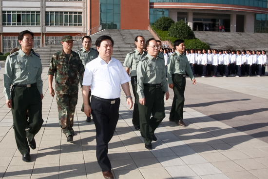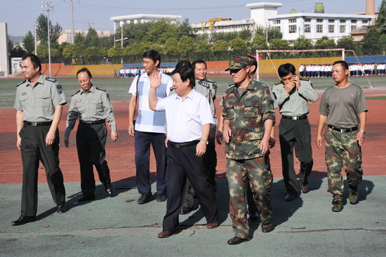 米书记首先来到老校区训练场地观看了方队的训练和军体拳表演。同学们挥拳踢腿雄健有力,一招一式整齐规范,充分展示了良好的精神风貌,强大的凝聚力和朝气蓬勃的战斗力。在新校区,当走到正在训练的二营女生方队前时,同学们在承训教官的带领下,齐声问好,展示出一派飒爽英姿。米书记在新校区体育场还观看了800人组成的方阵表演。同学们军容严整、士气高昂,步伐整齐。看到各位教官和学生冒着酷暑训练,米书记非常感动,反复叮嘱要注意休息,合理安排训练时间。