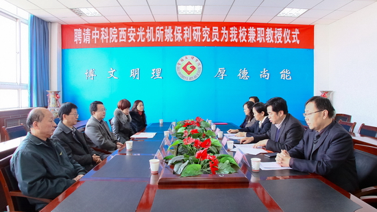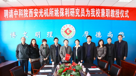 11月15日上午,我校在新校区图书馆第一会议室举行聘任仪式,中科院西安光机所瞬态光学与光子技术国家重点实验室主任,博士生导师姚保利研究员受聘为我校兼职教授。副校长赵荣侠出席会议并讲话,学科建设与研究生教育管理处处长吴毅主持会议。