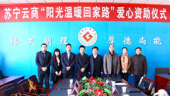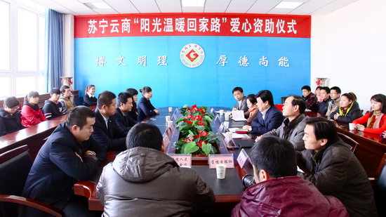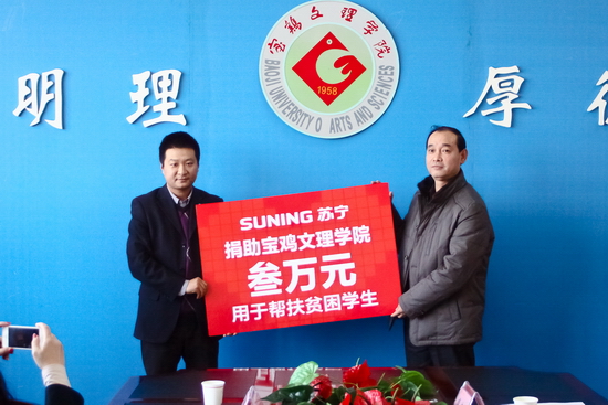 1月2日下午,我校在新校区举行苏宁云商“阳光温暖回家路”爱心资助仪式,由宝鸡苏宁云商商贸有限公司向我校捐款三万元,帮助100名家庭经济困难学生春节期间顺利返家。宝鸡苏宁云商商贸有限公司副总经理翁庆熙和我校党委副书记米晓东,学工部(处)长李周让,学工部副部长、团委书记黄玮,学生处副处长郝晓炜、党建波和辅导员代表、受助学生代表等参加了活动。资助仪式由党建波主持。
