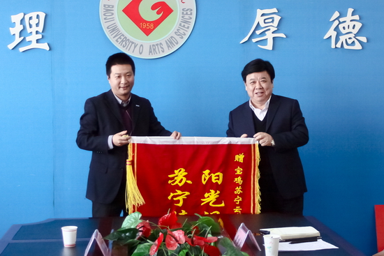 米晓东在讲话中代表学校对苏宁云商奉献爱心、资助我校学生的善举表示充分的肯定和衷心感谢。他向苏宁一行介绍了近年来我校事业发展、研究生教育获批和筹建宝鸡大学工作等情况和学生资助工作情况,并指出:学校高度重视家庭经济困难学生资助工作,此次宝鸡苏宁电器爱心资助善举,不仅为贫困大学生送去了温暖,也传承着中华民族扶贫济困、团结友爱的传统美德,必将带动更多的社会人士关注和关心教育事业。他提出三点希望:一是希望受助学生自强自立,把感恩之情化作勤奋学习的动力,刻苦学习,立志成才;二是希望受助学生心怀感恩,以实际行动回馈社会;三是希望学生资助管理部门创新工作方法,发挥育人功能,发挥资助项目对学生的激励作用,教育学生诚实守信,勤奋学习,全面发展。他表示:欢迎苏宁云商集团今后进一步加强与我校在大学生就业、资助、校园文化等方面的合作,积极营造全社会关心支持大学生成长成才的良好氛围,帮助更多的青年大学生实现自己的青春梦、成才梦。