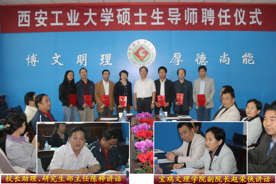 雷亚萍首先宣读了硕士生导师聘任名单。陈桦为我院受聘的8位教师颁发了硕士生导师聘书。张群宣读了西安工业大学《硕士生导师工作职责》,对硕士生导师的任职条件、职责以及有关审批与认定工作程序作了说明。