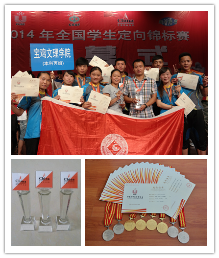 7月19日—23日,“2014年全国学生定向锦标赛暨‘中国四维杯’第十届全国测绘地理信息职工定向越野赛”在贵州安顺市镇宁布依族苗族自治县举办。我校代表队由罗光飞、翟晓英担任教练,朱俊涛、卢杰、邵婉贞、唐佩佩、任豪、刘海峰、覃东梅、汤欢8名运动员参加了高校丙组的比赛。我校定向越野代表队夺得高校丙组总团体亚军,朱俊涛、卢杰、唐佩佩、邵婉贞四人获得团队赛单项第一名和接力赛单项第二名的优异成绩。