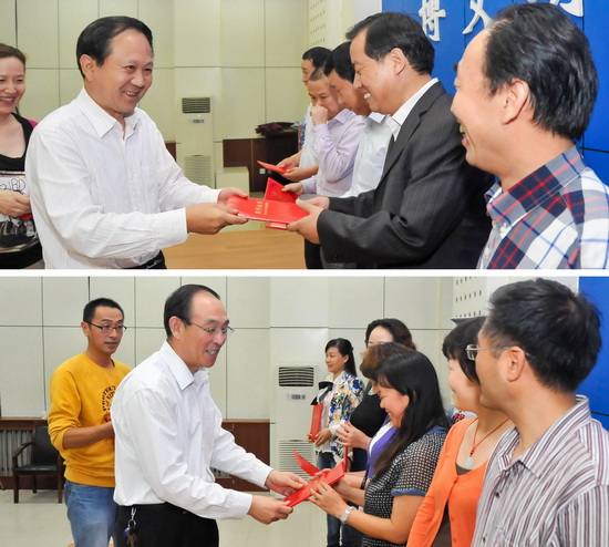 9月10日下午,我校在新校区甘棠厅召开2014年教师节庆教龄座谈会。校党委书记王志刚,校党委副书记、工会主席李全武,副校长杨子元出席会议并向年满25年、30年教龄的教职工颁发了荣誉证书。李全武主持会议并作总结讲话。