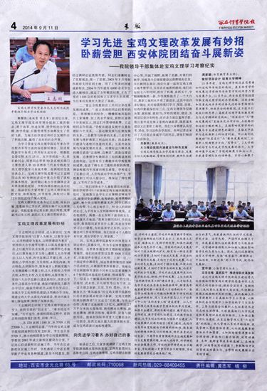 8月26日,西安体育学院党委书记吴长龄、校长周里带领50余名相关部门主要负责人和10名教职工代表专程来我校考察访问。《西安体育学院报》9月11日四版以《学习先进 宝鸡文理改革发展有妙招 卧薪尝胆 西安体院团结奋斗展新姿》为题专版对此进行了报道。(党委宣传部供稿)