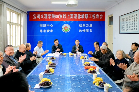 祝寿会上,白黎代表学校党委、行政和师生员工对今年年满80岁以上的离退休教职工表示崇高的敬意,感谢老同志们多年来对学校的理解与支持。他指出,广大老同志是学校建设发展的功臣,在提升学校办学层次、开展研究生教育与获批硕士学位授权单位等过程中作出巨大贡献,能为老同志服务是在职人员的福分。他强调,学校各项工作所取得的成绩,是与广大离退休老领导、老教师、老同志的贡献分不开的,老一辈教育工作者为我们创下了辉煌的基业,宝鸡文理学院是在大家的共同努力下才有了今天的跨越发展。他表示,学校领导班子将尽最大努力把学校建设好,力争在2020年建成宝鸡大学,不辜负老同志们的厚望;学校将继续关心老同志的生活,使离退休老同志共享学校改革发展成果。希望老寿星们今后继续发挥余热,关心支持学校建设,尤其是在教师队伍建设、人才培养方面再作贡献!在听取老寿星的发言后,他与老寿星们进行了交流互动,耐心解答了老同志们反映的问题,并表示,学校将对老同志们提出的意见、建议认真研究、落实。最后,他祝福老寿星们福如东海,寿比南山。