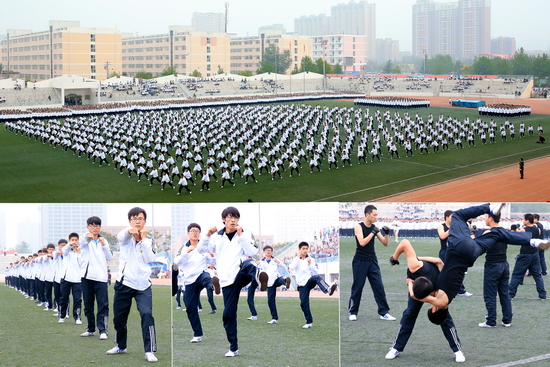 分列式结束后,分别由2014级新生组成的男子擒拿格斗、军体拳表演队进行了汇报表演。他们以昂扬的斗志、整齐划一的动作、霹雳勇猛之势,赢得了部队首长和学校领导的高度称赞。