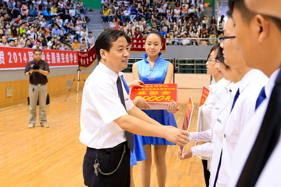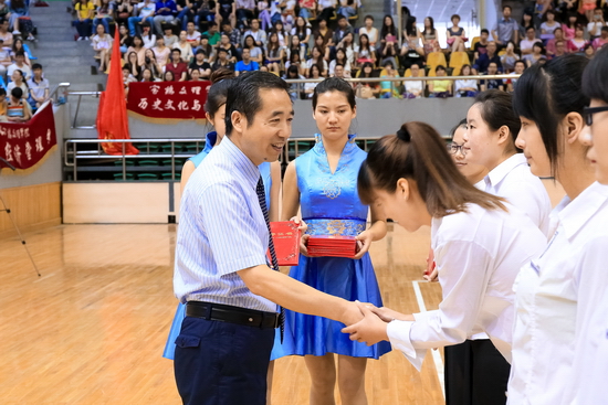 王志刚、白黎向毕业生代表颁发毕业证书;傅志军、赵荣侠为优秀毕业生代表颁发荣誉证书;杨子元为西部志愿者颁发奖金。招生办公室主任、教务处副处长栾宏宣读2014届学生毕业资格审查结果;学工部(处)长、毕业生就业指导服务中心主任李周让宣读优秀毕业生及大学生志愿服务西部计划学生名单。