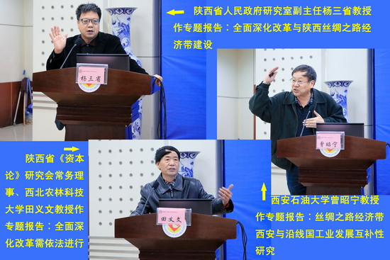 陕西省人民政府研究室副主任杨三省,西安石油大学曾昭宁教授,陕西省《资本论》研究会常务理事、西北农林科技大学田义文教授分别作了大会主题报告。专家们在专题发言阶段围绕依法治国与全面深化改革、丝绸之路经济带建设、农村经济体制改革、《资本论》研究等专题进行了深入的交流和探索。陕西省《资本论》研究会常务理事杨胜利教授作了大会总结。