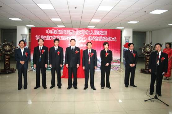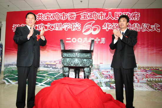 10月6日上午,中共宝鸡市委、宝鸡市人民政府祝贺我院50华诞赠鼎仪式在新校区图书馆一楼大厅隆重举行。中共宝鸡市委书记唐俊昌,宝鸡市市长戴征社、副市长刘桂芳,我院院长王志刚,院党委副书记米晓东、李全武,副院长王普藩等领导出席了赠鼎仪式。米晓东主持赠鼎仪式。