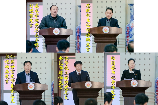 会上,思政部主任何振鹏、团委书记黄玮、外国语言文学系党总支书记冯森、美术学院党总支书记刘进锁、化学化工学院党总支书记李建峰分别作了交流发言。与会人员围绕会议主题,进行了认真讨论,高度评价了近十年来学校大学生思想政治教育工作所取得的成绩,并就我校进一步加强和改进大学生思想政治教育工作,构建和完善大学生思想政治教育工作长效机制,服务学校发展提出了建设性的意见和建议。