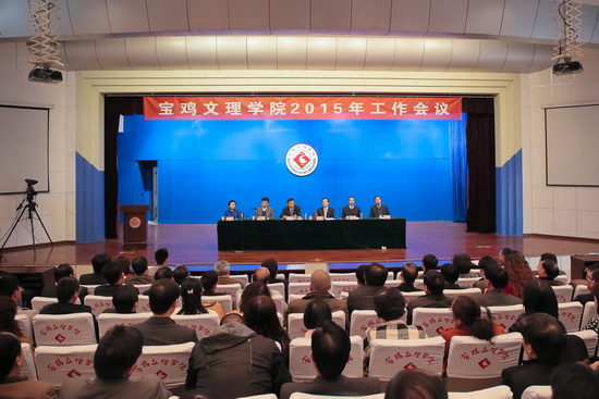 司晓宏作了题为《推进综合改革,加快内涵发展,努力实现建成宝鸡大学的奋斗目标》的讲话,他在讲话中对学校现有的基础、优势和面临的挑战进行了分析。从外部环境方面,他指出了高校间竞争日趋激烈的严峻形势和学校面临的前甩后追的局面。从内部条件方面,学校存在着以下不足和短板:一是学校学科建设和专业建设的整体水平不高;二是师资队伍数量不足,质量有待于进一步提高;三是办学空间狭小,教学和行政办公用房严重不足。在讲到关于学校发展顶层设计和基本思路的思考时,他从三个方面对学校现状进行了分析,并指出学校要向办教学研究型大学的方向靠拢,努力在在“十三五”期间建成宝鸡大学。在谈到办学基本理念时,他强调,学校要坚持内涵发展的理念,坚持进取、竞争、务实的理念,坚持开放包容的理念,坚持依法治校的观念,坚持学校事业发展与教职工和学生发展共赢的理念。他强调指出,关于2015年学校工作总的基调是全面深化综合改革,加快内涵发展。他就今年学校教学、科研、学科建设与研究生教育、教师队伍建设和人事分配制度改革、学生教育和管理、基础设施建设、深化综合改革、完善校内治理体系等方面的工作进行了全面的部署,并提出了明确的要求。他指出,全体教职员工在校党委和行政的团结带领下,要进一步坚定信心,鼓足干劲,以破釜沉舟、背水一战的勇气和精神,为实现宝鸡大学的目标而努力奋斗。