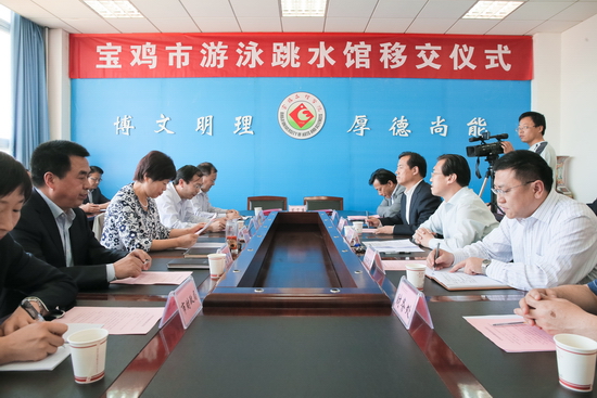 4月28日上午,我校与市政府举行宝鸡市游泳跳水馆移交仪式,宝鸡市游泳跳水馆正式移交给我校。校长司晓宏和副市长刘桂芳分别作重要讲话,副校长杨子元与市政府副秘书长、市体育局局长李富生签订了宝鸡市游泳跳水馆移交协议书。移交仪式由市政府副秘书长李献卿主持。