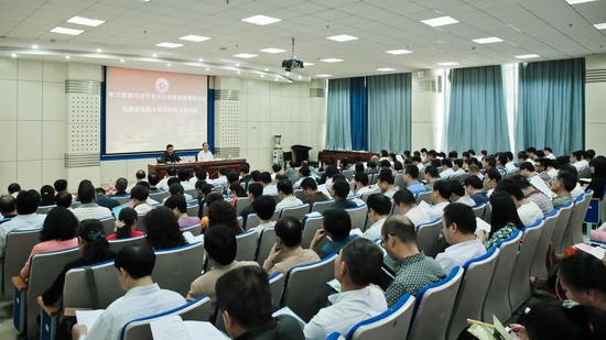 5月8日下午,我校在新校区木铎厅举办“学习贯彻习近平总书记来陕视察重要讲话,为建成宝鸡大学共同奋斗”研讨班开班仪式。校党委书记白黎出席开班仪式并作了题为《凝心聚力 鼓足干劲 努力开创我校各项事业新局面》的讲话,校党委副书记李全武主持开班仪式。全校副处级及以上干部、学生辅导员170余人参加了研讨班开班仪式。