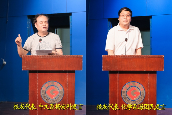 中文系81级校友杨宏科和化学系81级校友海团民先后发言,他们深情追忆了在校期间的学习生活情况和同学之谊,对学校的领导和老师们表示衷心的感谢和敬意!他们表示,尽管当年学习生活条件非常艰苦,但老师们踏实、扎实、老实的态度使他们受益终生,他们为母校的发展感到自豪,祝愿母校早日建成宝鸡大学,祝愿老师身体健康。