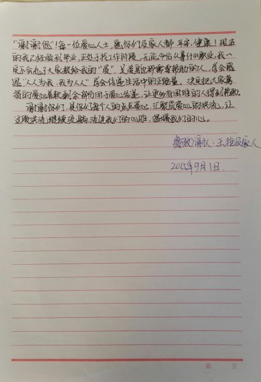 我校2014级美术学专业学生王艳在今年初不幸突患重病。为拯救这个贫困地区的特困学生,宝鸡市的公益组织和社会爱心人士纷纷伸出援手募集善款20多万元,经过数月的治疗后王艳转危为安。9月4日下午,王艳的家人再次从贵州赶赴宝鸡,将剩下的12万元爱心善款退还公益组织,让爱的力量延续,不让爱心受伤。