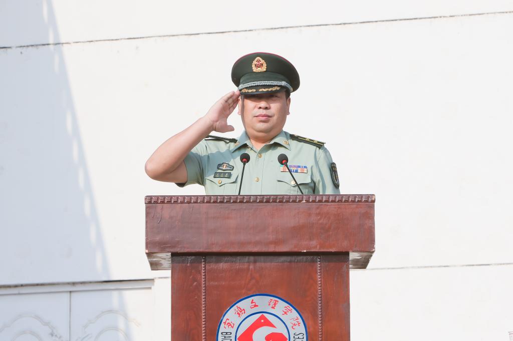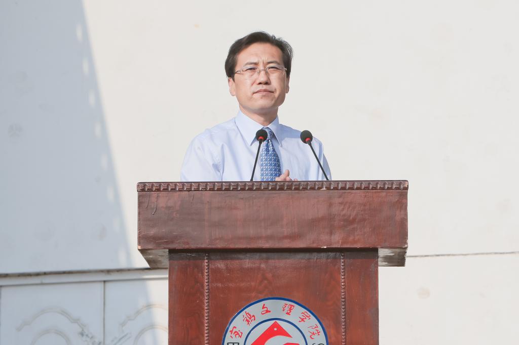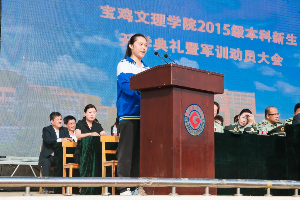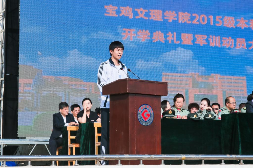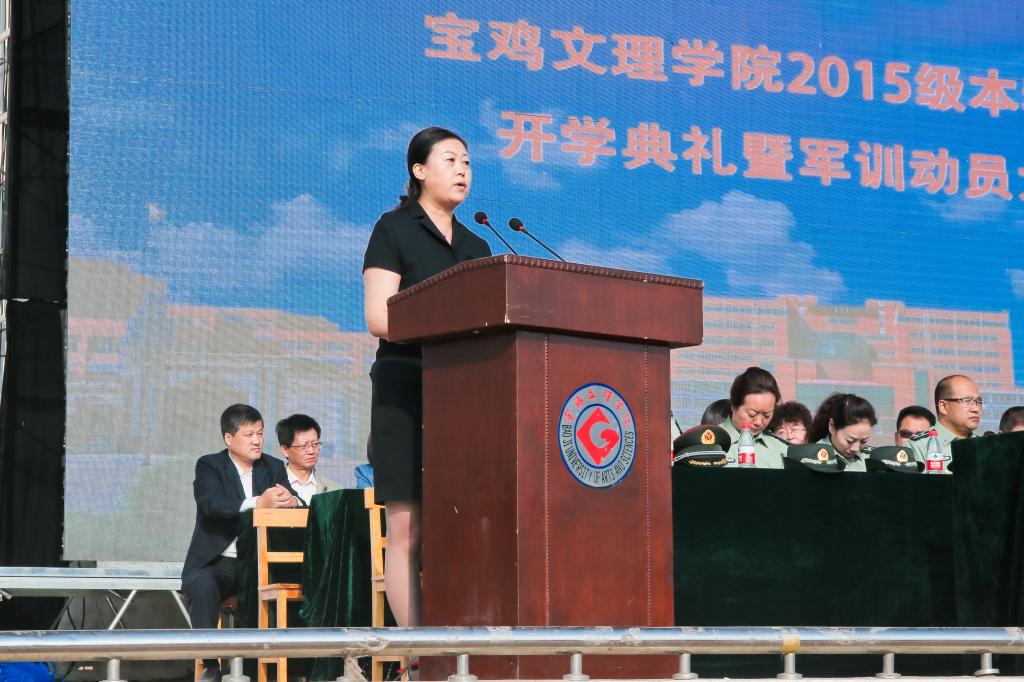司晓宏在讲话中代表学校党委和行政以及全校师生员工向来自全国31个省、市、自治区的4983名新同学表示热烈的欢迎和诚挚的祝贺!向承担我校大学生军训任务的96401部队官兵们表示崇高的敬意和衷心的感谢!他向新生介绍了宝鸡的历史文化底蕴和现代化建设过程中取得的殊荣;介绍了学校的历史、专业、师资、就业等基本情况以及学校近年来抢抓机遇、走内涵式发展道路所取得的成绩;号召全校上下同心同德、锐意进取,朝着建设教学研究型的高水平宝鸡大学的宏伟目标奋进。他希望2015级新生勤奋学习、刻苦攻读;修德砥品、健全人格;强身健体、全面发展;志存高远,勇于担当。最后,他勉励同学们要正确认识军训的意义与价值,以饱满的姿态认真投入到军训活动之中,发扬不怕苦、不怕累的精神,磨练意志,砥砺品格,努力习获解放军的优良作风,圆满完成大学生活的第一课。