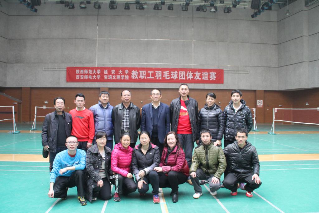 11月29日,延安大学、陕西师范大学、西安邮电大学、宝鸡文理学院四所高校教职工羽毛球团体赛在陕西师范大学雁塔校区综合馆举行。我校党委副书记李全武亲临现场为队员加油鼓劲。