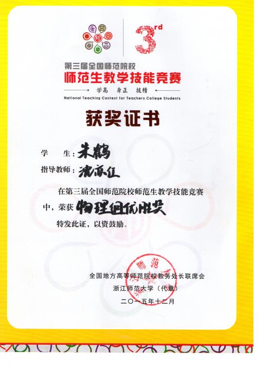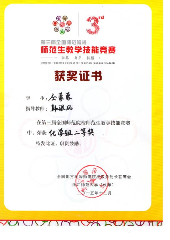 在12月4日至6日举行的第三届全国师范院校师范生教学技能竞赛中,我校选派的三名选手取得好成绩,其中,由韩银凤老师指导的化学化工学院学生仝蒙蒙荣获化学组二等奖,沈亦红老师指导的物理与光电技术学院学生朱鹤荣获物理组优胜奖。