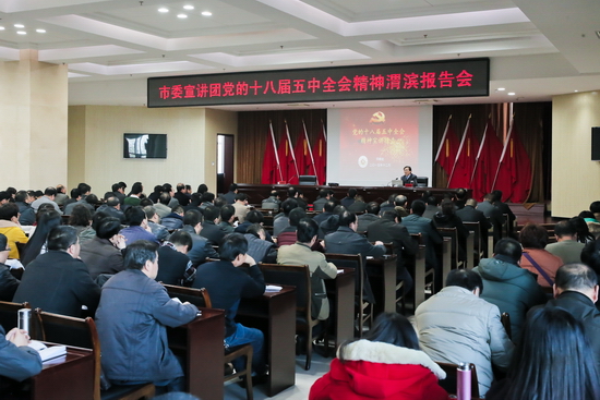 12月15日下午,市委宣讲团党的十八届五中全会精神报告会在渭滨区行政中心第一会议室举行。我校校长司晓宏教授作为市委邀请的宣讲团成员为渭滨区400余名副科级以上党员干部作了宣讲报告。报告会由渭滨区委副书记孙西军主持。