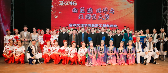 晚会在欢快的舞蹈《福娃报春》中开场,文理人三阳开泰辞旧岁,金猴狂舞喜迎春!文理人“旧岁已展千重锦,新年再登万丈楼”!情景剧《老师妈妈 妈妈老师》表演细腻,情节感人,轻声呼唤人间大爱老师的无私奉献。歌舞《一剪梅》,舞蹈《舒心的日子扭着过》、《长白瀑布》,无伴奏合唱《草原上的骏马》,歌伴舞《节日欢歌》、《等待》、《茉莉花》、《希望的田野》,民乐合奏《春节序曲》、《民歌连奏》以不同的表演形式给观众带来了优美的视觉享受,既潇洒自如、活力四射,又优雅柔美、脉脉含情,让我们感受到文理人就像一个和谐的大家庭,幸福在辛勤的工作中,幸福在闪光的智慧里,幸福在共筑宝大梦的实践中。诗朗诵《写给未来的你》、音乐情景剧《打开镜头 放眼未来》及校领导和爱乐合唱团表演的合唱《团结就是力量》让我们看到了文理人将携手共进、众志成城、描绘共建宝鸡大学的宏伟诗篇,把梦想写给未来宝鸡大学的雄心壮志!音乐情景剧《打起手鼓唱起歌》演绎了一幕幕青年大学生为实现自己的人生理想奔赴西部边陲新疆可歌可泣的动人诗章!宝文理经历了凤凰的涅磐,挺起了坚强的脊梁,宝文理将《启航》2016,超越发展的梦想。晚会在《共圆中国梦》庞大的表演阵容中圆满落下帷幕。晚会结束后,学校党政领导与演职人员合影留念。