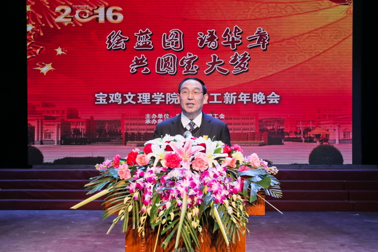 晚会开始前,校长司晓宏发表了热情洋溢的新年致辞。他代表学校党委、行政向辛勤工作、默默耕耘在教学、科研、管理、服务岗位上的全体教职工,向负笈求学、刻苦攻读的莘莘学子,向老当益壮、大力支持学校建设发展的离退休老领导、老同志,向心系母校、报效社会的海内外校友,向长期关心、鼎力支持学校事业发展的社会各界人士,致以诚挚的问候、良好的祝愿和衷心的感谢!他指出,岁月不居,时节如流。2015年,是文理人团结奋斗、阔步前进,各项工作展现出新气象的一年。这一年,“三严三实”专题教育扎实开展,党建工作迈上了新台阶,人才培养质量稳步提高,学科建设与科研水平持续提升,师资队伍建设继续出现良好势头,学生综合素质和就业竞争能力不断增强,学校基础设施建设稳步推进,后勤服务保障能力不断增强,创建高水平宝鸡大学工作全面启动并扎实推进。在新的一年里,让我们以更加进取的精神状态,坚定信心、砥砺斗志、同心同德、埋头苦干,为早日实现建成高水平宝鸡大学的宏伟目标而努力奋斗!