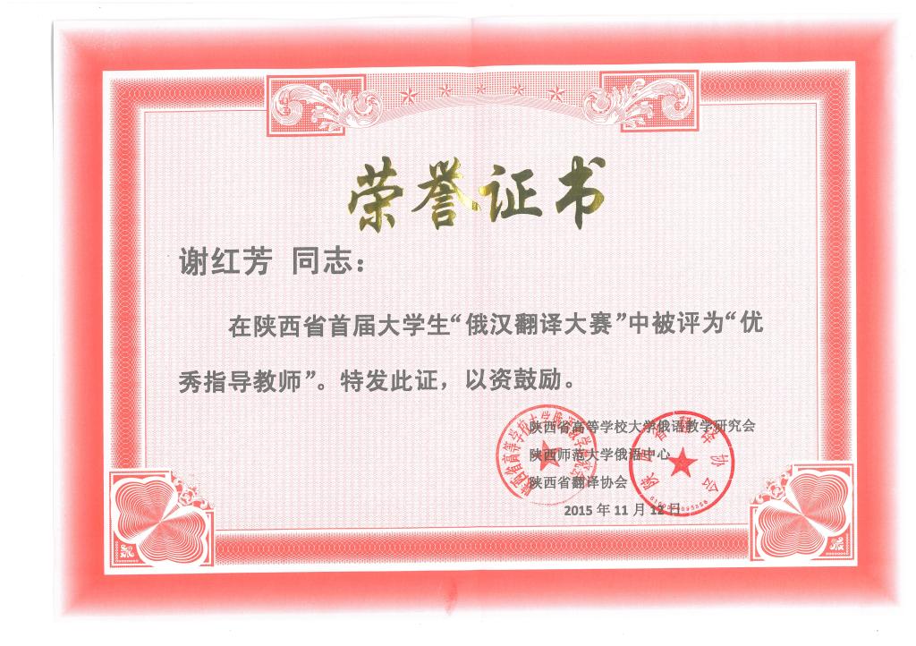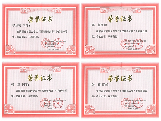 近日,从陕西省首届大学生俄汉翻译大赛组委会获悉,我校外语系2012级英语专业张娟利同学荣获一等奖,2012级商务英语专业李玺同学荣获三等奖,2012级英语专业张茹、张靖两名同学均荣获优秀奖。谢红芳被评为“优秀指导教师”。