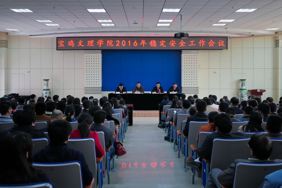 3月18日下午,我校在新校区木铎厅召开2016年稳定安全工作会议。校党委书记白黎、校长司晓宏、校党委副书记米晓东、李全武出席会议。白黎作重要讲话,米晓东传达了省委高教工委书记李仲为在全省高校稳定安全工作会议上的讲话,李全武宣读了表彰决定。书记、校长与部分院系、职能部门负责人签订了《宝鸡文理学院2016年稳定安全责任书》。司晓宏主持会议并讲话。