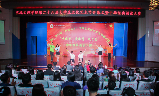 开幕仪式结束后,举行了中华经典诵读大赛。宝鸡市话剧团著名演员、市朗诵协会副会长魏齐军,宝鸡市话剧团著名演员、导演冯子夏,原美术学院党总支书记、宝鸡市朗诵协会会长刘进锁,文传学院播音与主持专业教研室主任赵玲,教务处实践科科长杨伟东担任此次比赛的评委。