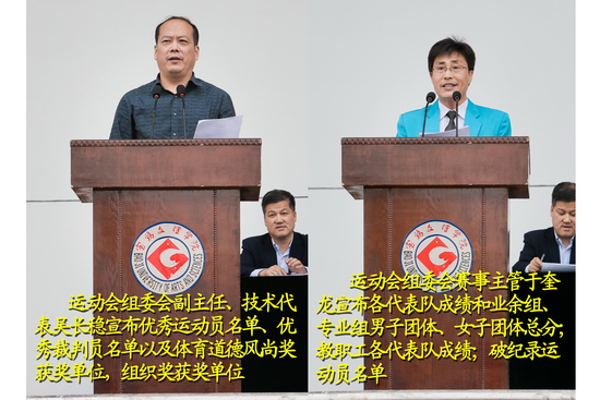 运动会组委会赛事主管于奎龙宣布了各代表队成绩和业余组、专业组男子团体、女子团体总分,教职工各代表队成绩,破纪录运动员名单。运动会组委会副主任、技术代表吴长稳宣布优秀运动员名单、优秀裁判员名单以及体育道德风尚奖、组织奖获奖单位。运动会组委会副主任、秘书长王富平主持颁奖仪式。