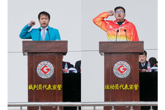 裁判员代表体育系教师罗光飞和运动员代表美术学院马跃同学分别向大会庄严宣誓。
