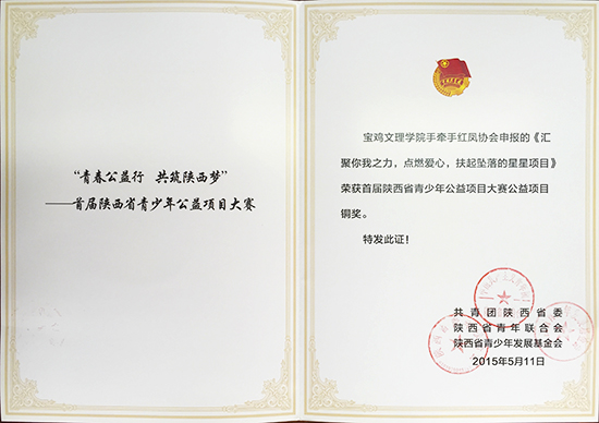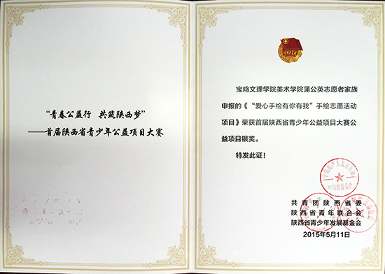 近日,由团省委、省青联和省青少年发展基金会共同举办的“青春公益性,共筑陕西梦”首届陕西省青少年公益项目大赛中,我校蒲公英志愿者家族申报的《“爱心手绘有你有我”手绘志愿活动项目》获得大赛银奖;校手牵手红凤协会申报的《汇聚你我之力,点燃爱心,扶起坠落的星星项目》荣获大赛铜奖。