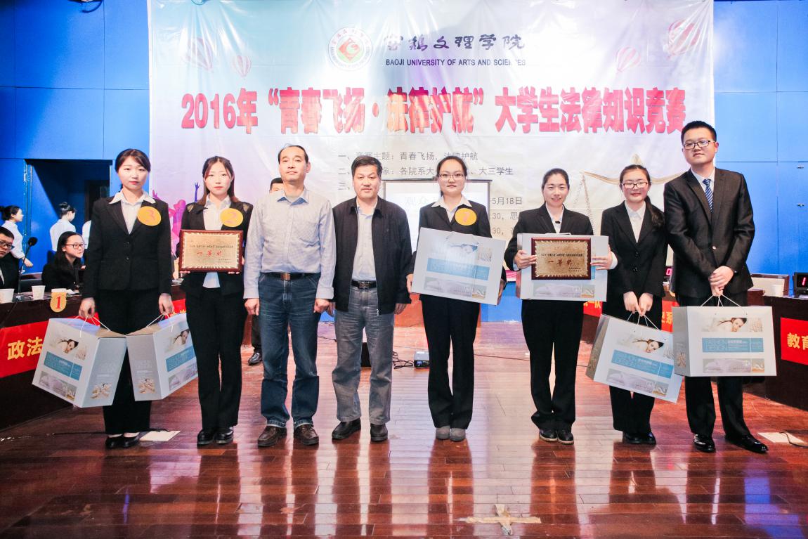 比赛伊始,主持人秦雨、白雪宣读了比赛细则及评分规则。比赛由必答题、抢答题、风险题、自救题、辩论题五个主要环节组成。在比赛过程中,进入决赛的政法学院一队、政法学院二队、教育学院代表队、文学与新闻传播学院代表队、历史文化与旅游系代表队、电子电气工程学院代表队在每个环节都踊跃参与,各参赛队员流利的语言,敏捷的思维,给观众留下深刻印象。在辩论阶段,双方选手分别围绕“药家鑫是否该判处死刑”、“法律保护的是秩序还是自由”、“恶法亦法恶法非法”三个辩题展开激烈的辩论。选手们缜密的思维,幽默的语言,赢得了现场观众的阵阵掌声。在互动环节,观众积极参与,现场气氛活跃。经过激烈角逐,政法学院一队与历史文化与旅游系代表队最终荣获本次比赛的第一名,政法学院二队与电子电气工程学院代表队获得第二名,教育学院代表队与文学与新闻传播学院获得第三名。参赛队员获得与代表队名次相同的个人奖。历史文化与旅游系赵博伟同学获得最佳风采奖。