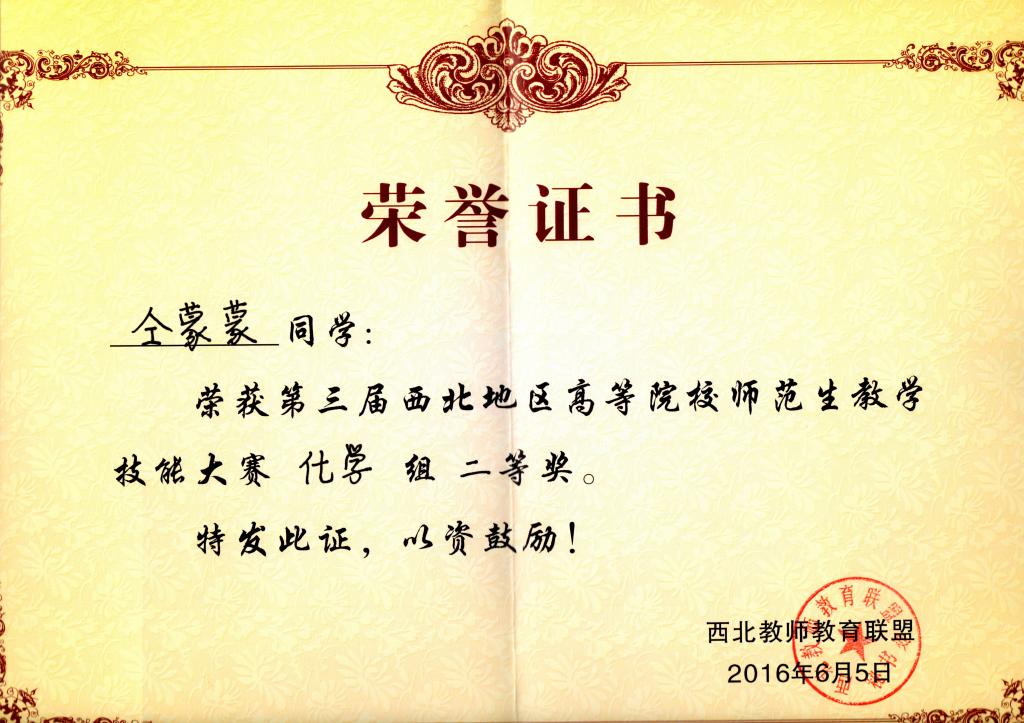 6月3日—5日,第三届西北地区高等院校师范生教学技能大赛在陕西师范大学举行。我校选派的3名选手在本次大赛上荣获佳绩,其中化学化工学院学生仝蒙蒙荣获化学学科二等奖(指导教师:韩银凤),物理与光电技术学院学生王妍获物理学科二等奖(指导教师:沈亦红),历史文化与旅游系学生武乙乔获历史学科三等奖(指导教师:王岁孝)。