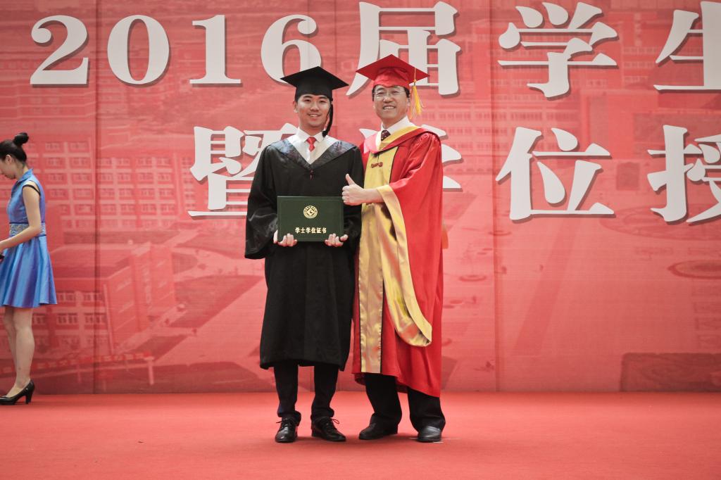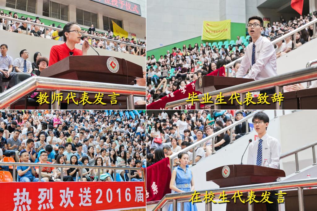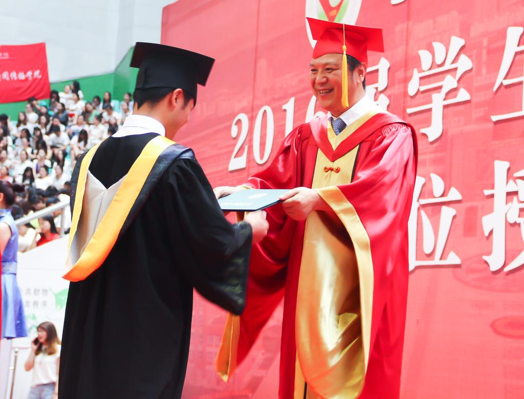 白黎、司晓宏为学士学位获得者代表扶正流苏、颁授学位证书;傅志军宣读2016届毕业生毕业资格审查结果和学士学位授予决定;赵荣侠宣读优秀毕业生表彰决定;李全武、杨子元为优秀毕业生代表颁发荣誉证书。