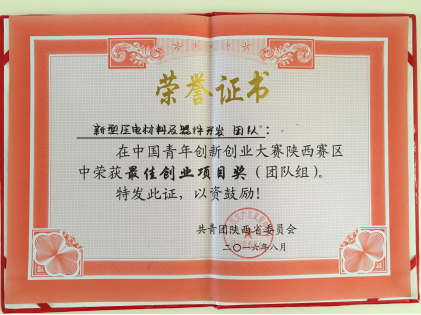 近日,在由团省委、省科技厅、省人社厅、省中小企业促进局联合主办的中国青年创新创业大赛(陕西赛区)暨2016陕西(青年)科技创新创业大赛中,我校化学化工学院胡登卫博士指导的“压电新能源创新团队”张珍(队长)、潘拴拴、牛晓梅、杨水龙、肖贞、王越、郭林康、孙宏、张雪妮、王金科、崔万劳等参赛项目《新型压电材料及器件开发》荣获“最佳创业项目奖”(团队组)。该比赛项目是在我校“新型功能材料研究与开发团队”资助下完成的。