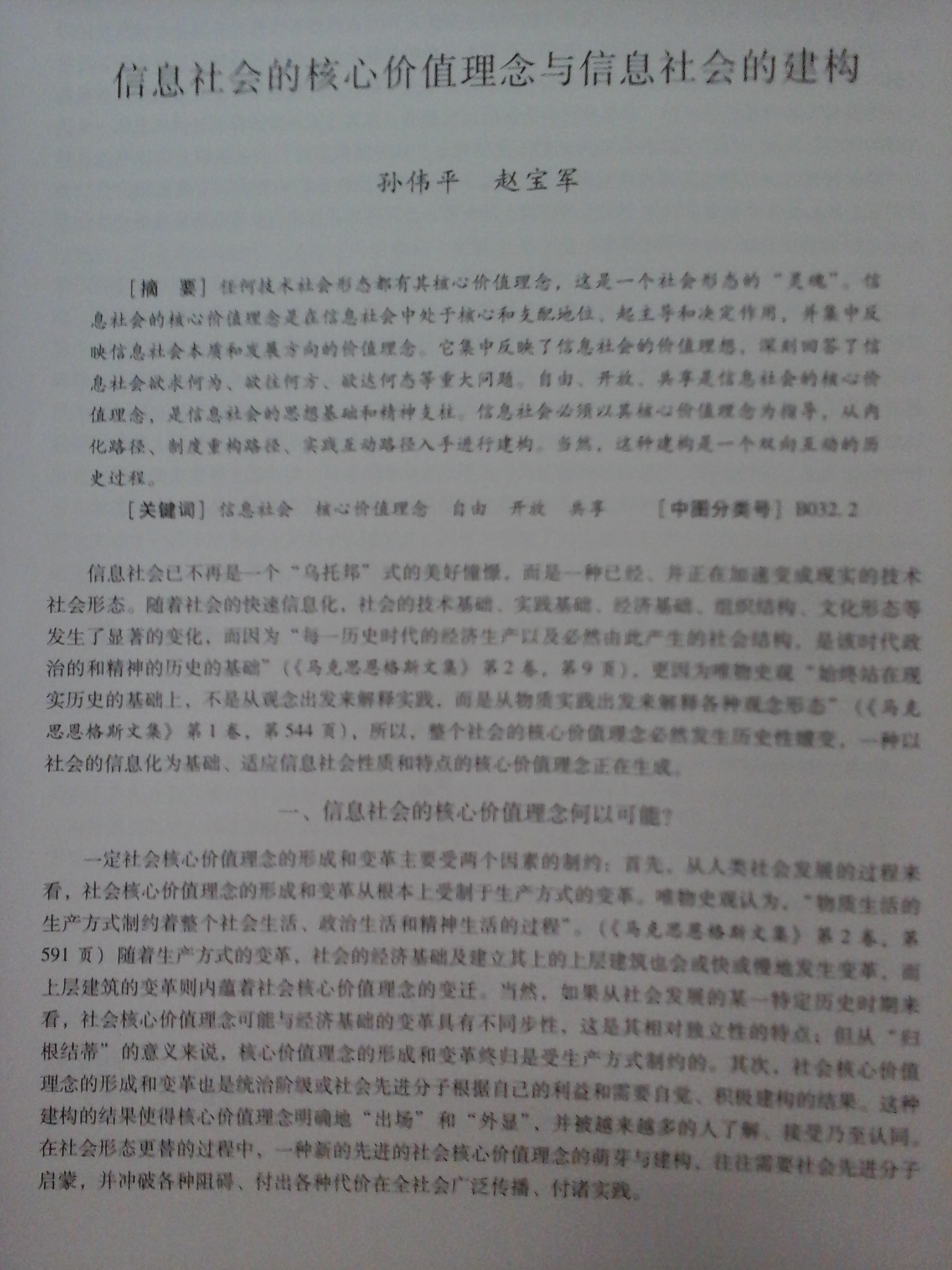 9月25日,《哲学研究》(2016年第9期)刊发了我校哲学系在读博士赵宝军署名的学术论文《信息社会的核心价值理念与信息社会的建构》。该文运用马克思主义哲学的立场、观点、方法首次全面、系统、深入地探究了信息社会的核心价值理念,回答了信息社会欲求何为、欲往何方、欲达何态等重大现实问题,指明了信息社会建构的方向和路径。
