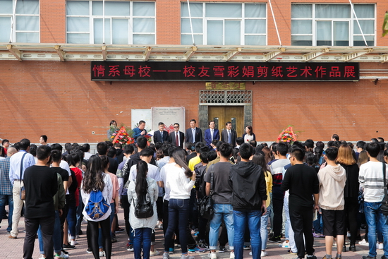 10月1日上午,情系母校——校友雪彩娟剪纸艺术展开幕式在艺术楼前举行。校党委书记白黎、校长司晓宏、校党委副书记栾宏、副校长杨子元、王富平出席开幕式。美术学院院长王宝强主持开幕式。