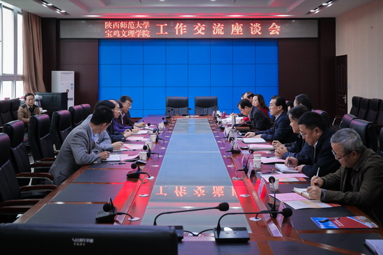 座谈会上,司晓宏代表学校党政和全体师生员工对程光旭一行来校调研交流表示热烈欢迎!他从学校的办学历史、师资队伍建设、创建高水平大学等方面介绍了我校的基本情况。希望在我校创建宝鸡大学的过程中与陕西师范大学能够积极地牵手共建,并给予我校实质性的支持。程光旭简要介绍了陕西师范大学的办学历史、发展现状以及近年来教育教学等方面所取得的成绩和主要做法。他表示,陕西师范大学和宝鸡文理学院历史渊源深厚,宝鸡文理学院具有鲜明的办学及学科特色,在省属同类院校中发展快、有影响、实力强。陕西师范大学将全力支持宝鸡文理学院创建高水平宝鸡大学,积极推进牵手共建,在人才培养、科学研究、学科建设、师资队伍建设等方面进行深度帮扶、合作与交流。