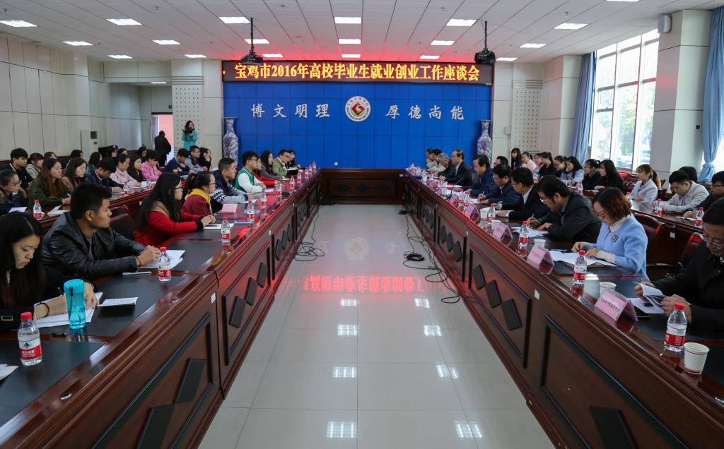 10月29日,我校与宝鸡市人社局在新校区联合举办宝鸡市2016年“人社局长高校行”暨名优企业进校园活动。校党委副书记栾宏出席宝鸡市2016年高校毕业生就业创业工作座谈会,并与宝鸡市人力资源和社会保障局局长张田力一行进行座谈。宝鸡市人社局副局长杨天明、学生处处长、就业指导服务中心主任李周让、副主任党建波、宝鸡市人社局各职能部门负责人与我校70名毕业生代表参加了座谈会。