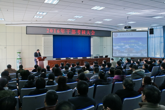 1月13日下午,我校在木铎厅召开2016年干部考核大会暨党总支书记抓党建述职评议考核大会。校党委书记白黎、校长司晓宏、校党委副书记傅志军、栾宏,副校长赵荣侠、杨子元、王富平出席会议,会议由傅志军主持。