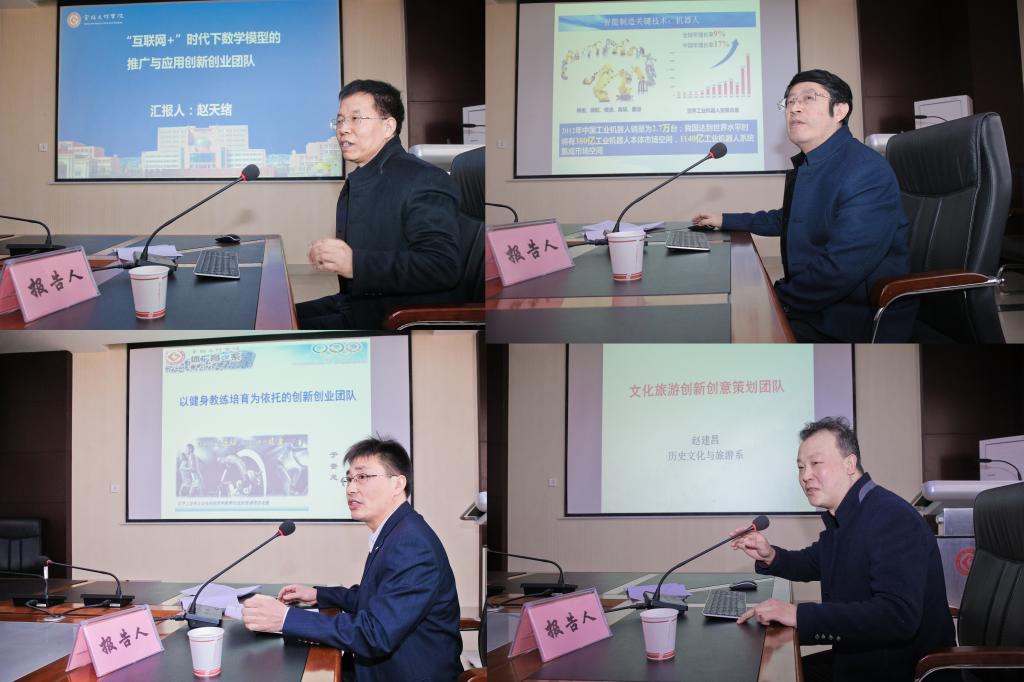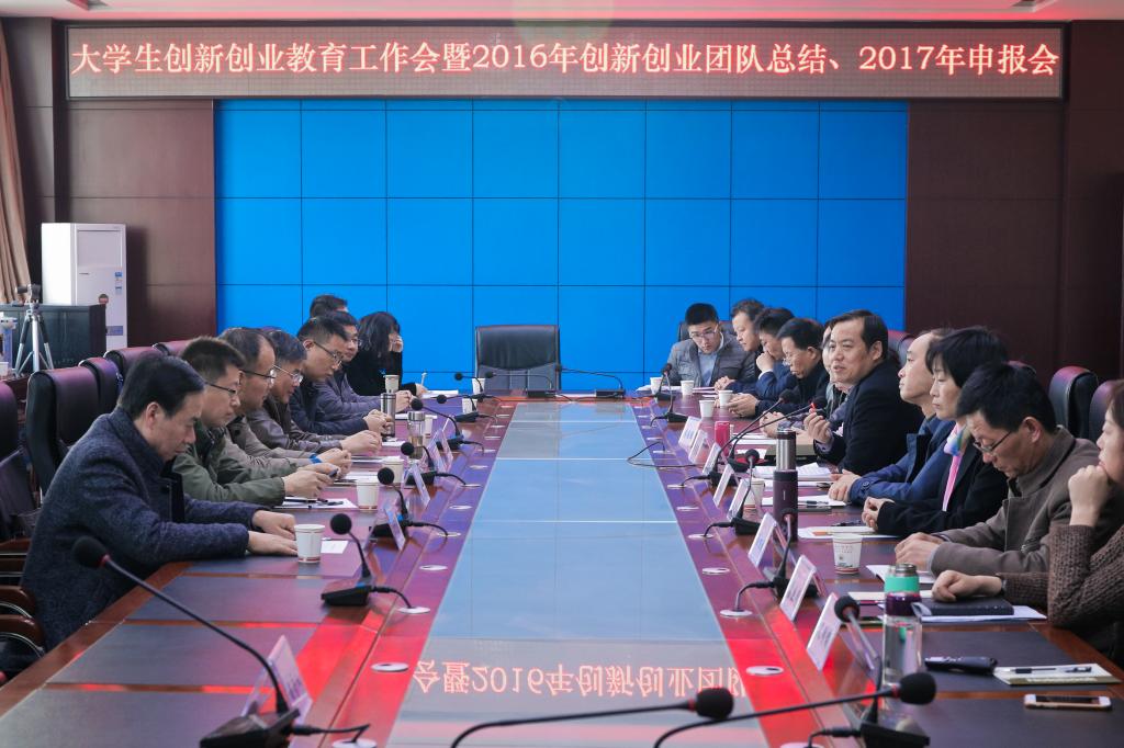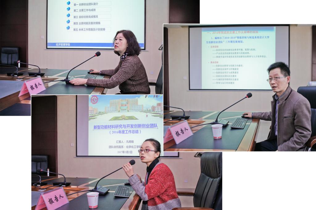 李景宜从学校创新创业教育机构建设、制度建设、师资队伍建设和平台建设等方面对2016年大学生创新创业教育工作情况作了汇报。首批建设的“基于互联网的商业模式实训和培育”大学生创新创业团队负责人桑晓靖、“智能控制与制造系统设计”团队负责人段旭朝、“新型功能材料研究与应用”团队负责人凡明锦分别做了2016年工作汇报。2017年新申报的8个团队负责人分别进行了申报答辩。校内外评审专家通过函评、听取团队汇报等方式进行了评审,并对学校的创新创业教育工作提出了建设性的意见和建议。