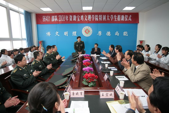 11月6日下午,96401部队2008年资助特困大学生捐助仪式在我院新校区第一会议室举行。96401部队副政委万中山、政治部副主任刘文俊,院党委书记赵怀礼、党委办公室主任张鹏及相关部门领导出席会议。学工部部长李建民主持会议。