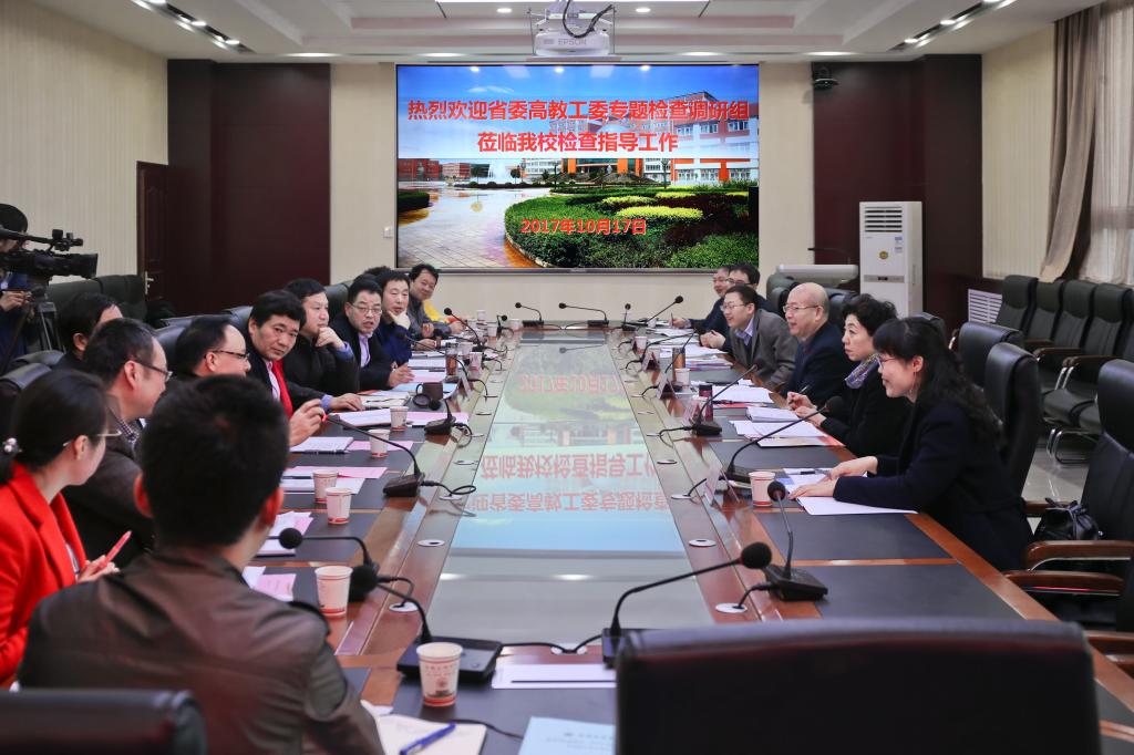 10月17日上午,省委高教工委检查调研组来我校检查辅导员队伍建设、学生心理健康教育和共青团工作。检查组由陕西国际商贸学院党委书记赵军政担任组长,西安音乐学院学工部部长张津波、西安工程大学团委书记王晓先、西北工业大学心理健康教育中心主任张洪英、省委高教工委干部薛原为成员。校党委书记白黎、党委副书记栾宏出席调研座谈会。