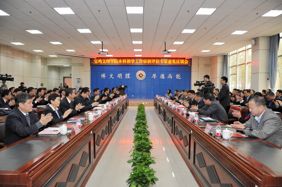 孔建益代表专家组反馈了意见。他指出,11月5日至9日,专家组在前期审阅学校自评报告和本科教学基本状态数据分析报告等资料的基础上进校考察,进校之后,专家组开展集体考察、走访二级学院和职能部门、深度访谈、看课听课、调阅各类文件资料、召开座谈会、走访校外实训基地和用人单位等活动,对学校本科教学工作进行了多层次全方位的分析和评估。专家组认为,宝鸡文理学院对本科教学审核评估工作高度重视,认识统一、组织有力,各项工作规范、扎实有效,从学校领导到师生员工表现出了高度的凝聚力和自觉性,特别是广大教职员工所展现出的工作状态和精神面貌,学生热爱学校和积极进取的态度,井然的教学秩序和优美的校园景色,都给专家组留下了深刻的印象。专家组一致认为,宝鸡文理学院的本科教学工作较好地实现了自己的定位和目标。他指出,专家组的总体印象是办学定位与培养目标明确;领导重视教学,教学中心地位突出;主动挖掘区域文化优势,文化育人成效显著;推进学校内部管理体制改革,不断完善现代大学治理体系;深化教育教学改革,专业和学科建设取得明显成效;加大人才引进力度,师资队伍建设取得成效。尤其是学校今年抓住了几个重大机遇:新增硕士学位点教育部已经公示完毕,学校硕士点有望翻番,同时被列为新增博士学位授予单位立项建设计划;学校升大工作列入陕西省和教育部“十三五”院校设置规划;签订了省市共推宝鸡文理学院建成宝鸡大学协议,必将对学校发展产生重大影响。同时,他指出了学校本科教学工作存在的不足:一是师资队伍建设有待进一步加强;二是教学改革需要进一步深化;三是教学条件、资源建设有待进一步加强;四是教学质量保障体系有待进一步完善;五是国内外合作交流和国际化办学水平有待提升。最后,他对学校本科教学工作提出了六点建议:一是优化师资结构,加大高层次人才引进力度;二是加强本科教学内涵建设,加大教学改革力度,确保教学质量有序提高;三是切实加强教学硬件资源建设,加快推进新校区建设步伐;四是加强教学质量保障体系建设;五是开放办学,加快国际化进程,提高国际化办学水平;六是建议陕西省教育厅、宝鸡市人民政府进一步加大对宝鸡文理学院的支持力度。