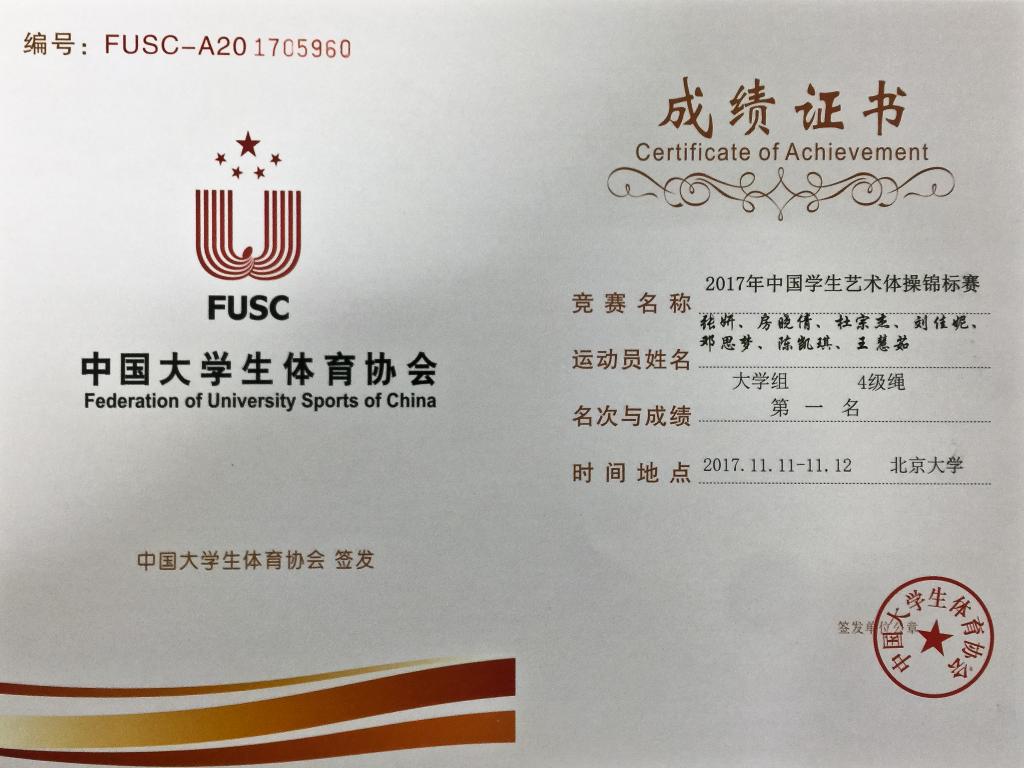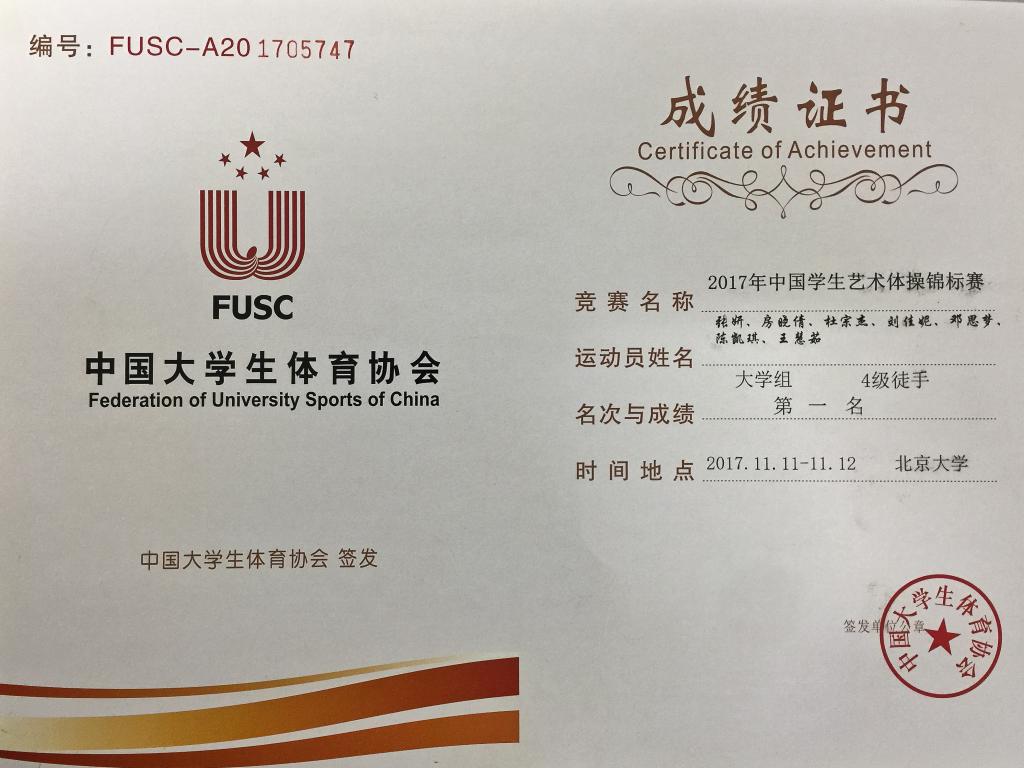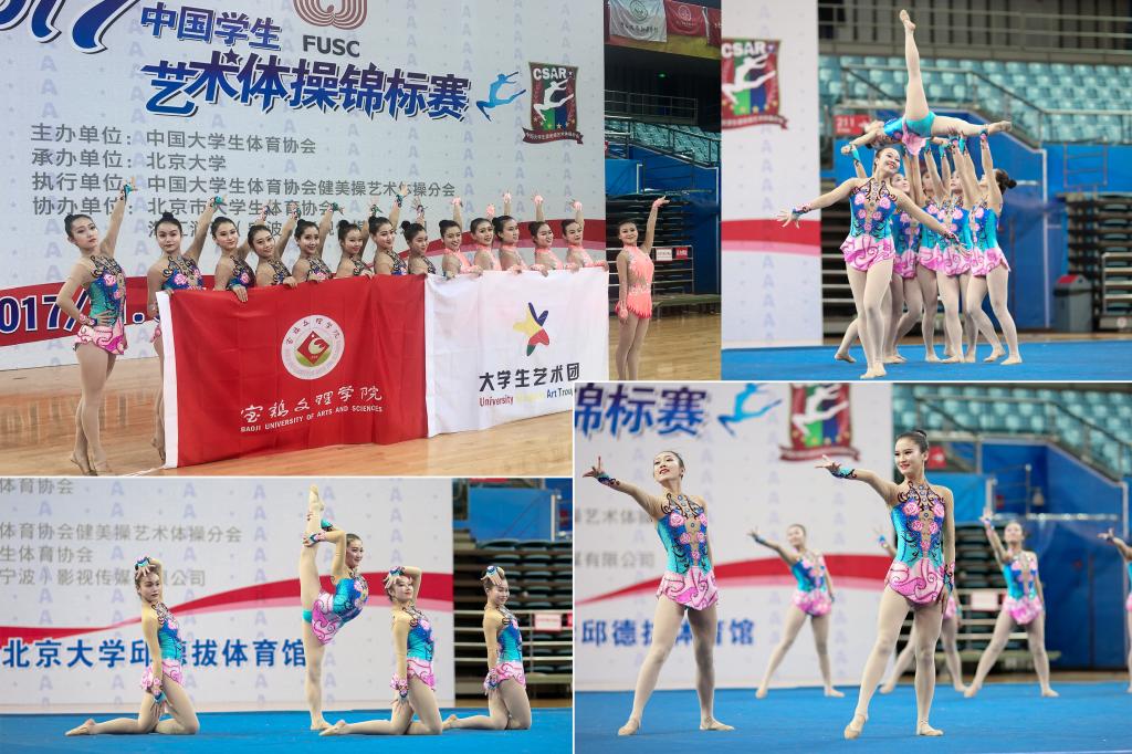 11月9日-13日,2017年中国学生艺术体操锦标赛在北京大学邱德拔体育馆举行,我校大学生艺术团艺术体操队一举夺得集体项目三项第一、两项第二、一项第三的骄人成绩,并获得体育道德风尚奖,实现了我校在全国艺术比赛中的首次突破。