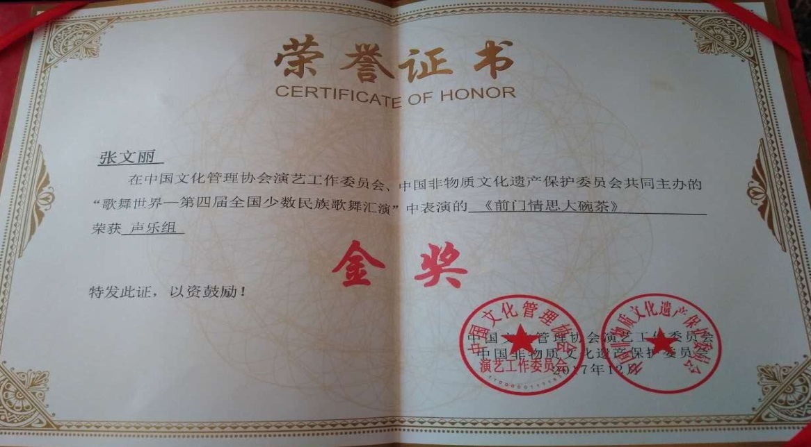 近日,我校音乐学院教师张文丽在“歌舞世界——第四届全国少数民族歌舞汇演”总决赛中以一首《前门情思大碗茶》荣获声乐组金奖,并受邀参加了《孝道行天下》精品节目展演录制。