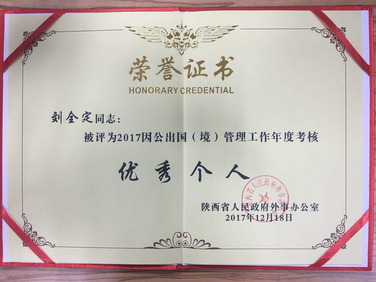 12月22日上午,陕西省人民政府外事办公室组织召开全省因公出国(境)管理工作会议,表彰了2017年在因公出国(境)管理工作中表现突出的先进单位和优秀个人。我校国际合作与交流处副处长刘全定荣获2017因公出国(境)管理工作年度考核优秀个人称号。(国际合作与交流处 文、图/李嘉静)