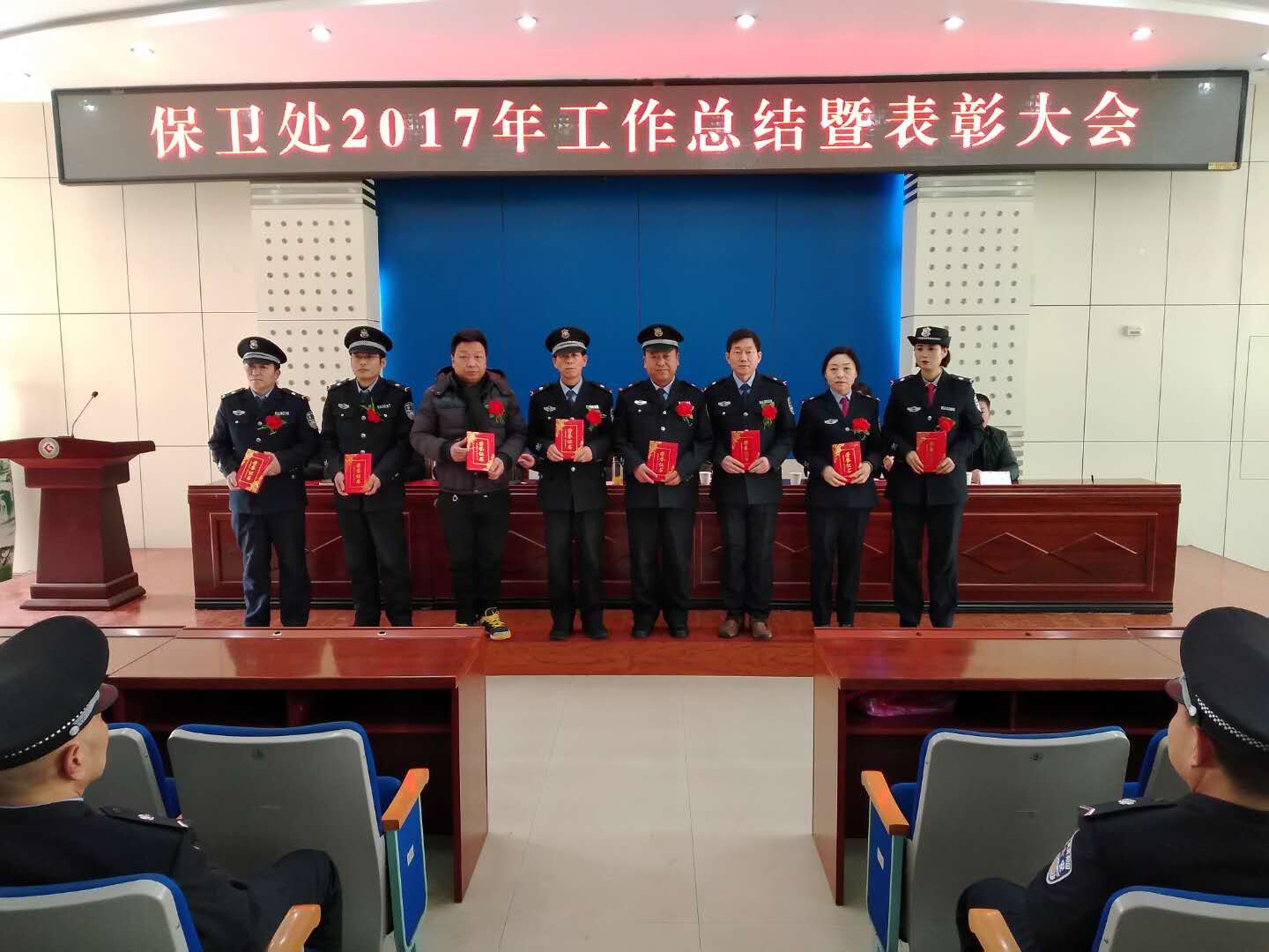 会上宣布了学校党委组织部关于保卫处综合科、治安科及校卫队3名科级干部的任命文件,表彰奖励了保卫处2017年度工作突出的10名校卫队员,并颁发了荣誉证书。