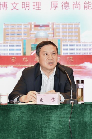 白黎作了题为《不忘初心谋发展 牢记使命争一流 写好新时代高水平大学建设“奋进之笔”》的讲话。他在讲话中指出,2017年,校党委在省委高教工委和省教育厅的正确领导下,管党治党、办学治校主体责任进一步落实,把方向、管大局、作决策、保落实的重要作用进一步发挥,理论武装得到新提升,思想政治工作焕发新活力,人才队伍建设取得新成效,意识形态和宣传工作得到新加强,综合改革呈现新气象,学校各项事业发展迈上了新的台阶。重点表现为:党代会绘就了未来发展新蓝图;教学工作取得新成果;综合实力迈上新台阶;“创大”工作实现新突破;干部队伍建设得到新加强;党建工作迈出新步伐。他深入分析了学校面临的形势和任务,提出学校2018年工作的指导思想是:高举中国特色社会主义伟大旗帜,贯彻落实党的十九大精神,以习近平新时代中国特色社会主义思想为指导,聚焦“追赶超越”定位和“五个扎实”要求,围绕服务“五新”战略任务,全面加强党的领导,贯彻党的教育方针,落实立德树人的根本任务,以创建高水平宝鸡大学为奋斗目标,以问题为导向,以人才培养为中心,以学科建设为龙头,以师资队伍建设为关键,以深化改革为动力,凝心聚力,砥砺前行,奋力开创新时代学校事业发展新局面。他强调, 2018年党委主抓的重点工作为:抓考核、促“创大”,抓改革、利“创大”,抓干部、成“创大”;要聚焦根本保证、全面推进从严治党,聚焦立德树人、不断提升思想政治工作质量,聚焦文化建设、大力营造良好育人环境,聚焦稳定安全、为升大提供保障。各级干部要抓人才、提高竞争力,抓服务、提高凝聚力,抓落实、提高执行力。