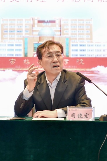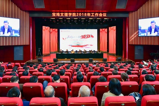 司晓宏作了题为《凝心聚力 砥砺奋进 为建成高水平宝鸡大学努力奋斗》的讲话。他在讲话中指出,2017年是学校发展历史上极不平凡的一年,在党政班子和全体师生员工的共同努力下,学校重点工作迈出坚实步伐,取得了具有重要历史意义的建设性发展成就:圆满完成了本科教学审核评估工作,打赢了审核评估攻坚战,赢得了评估专家的普遍好评;学科建设取得显著成绩,成功获批为陕西省“拟新增博士学位授予单位立项建设单位”,硕士学位点实现了翻番增长;科研工作再创历史新高,高层次科研项目、科研论文、科研经费、科研奖项均获佳绩;人事制度改革和师资队伍建设深入推进;学生教育管理工作进一步加强;基建工作和后勤服务工作进一步加强;校内综合改革及现代大学制度建设扎实推进;“创大”工作迈出坚实步伐;民生状况进一步改善。他深入分析了当前学校发展面临的挑战:即高等教育发展的竞争形势日趋激烈;创大更名工作既面临良好机遇更面临严峻挑战;办学经费和财力状况面临巨大压力与挑战。他对学校2018年重点工作进行了强调:一要扎实做好创大更名工作,加快创大步伐;二要认真实施本科教学审核评估整改工作,以优异成绩迎接审核评估的中期检查和整改验收;三要加快一流学科建设,启动博士学位授予单位立项建设工作;四要进一步加强科研工作,确保高层次项目数量、质量、科研经费持续增加;五要深化人事管理制度改革,实施好全员岗位聘任工作;六要推进后勤、基建等工作,为师生提供良好的工作学习和生活环境;七是拓宽筹措资金渠道,确保办学经费稳步增长;八是提高国际化办学水平,不断开阔师生的国际化视野;九是积极推进民生工程和扶贫工作,不断提高师生员工的获得感。